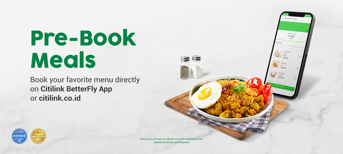 We serve a menu with a variety of Indonesian flavors. You can order food before flying through the Citilink.co.id website and the BetterFly Citilink mobile app.